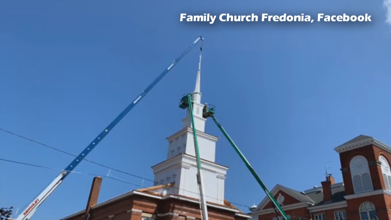 Earlier this month, Family Church Fredonia raised a new steeple just 14 months after a devastating fire destroyed the iconic clock tower.
