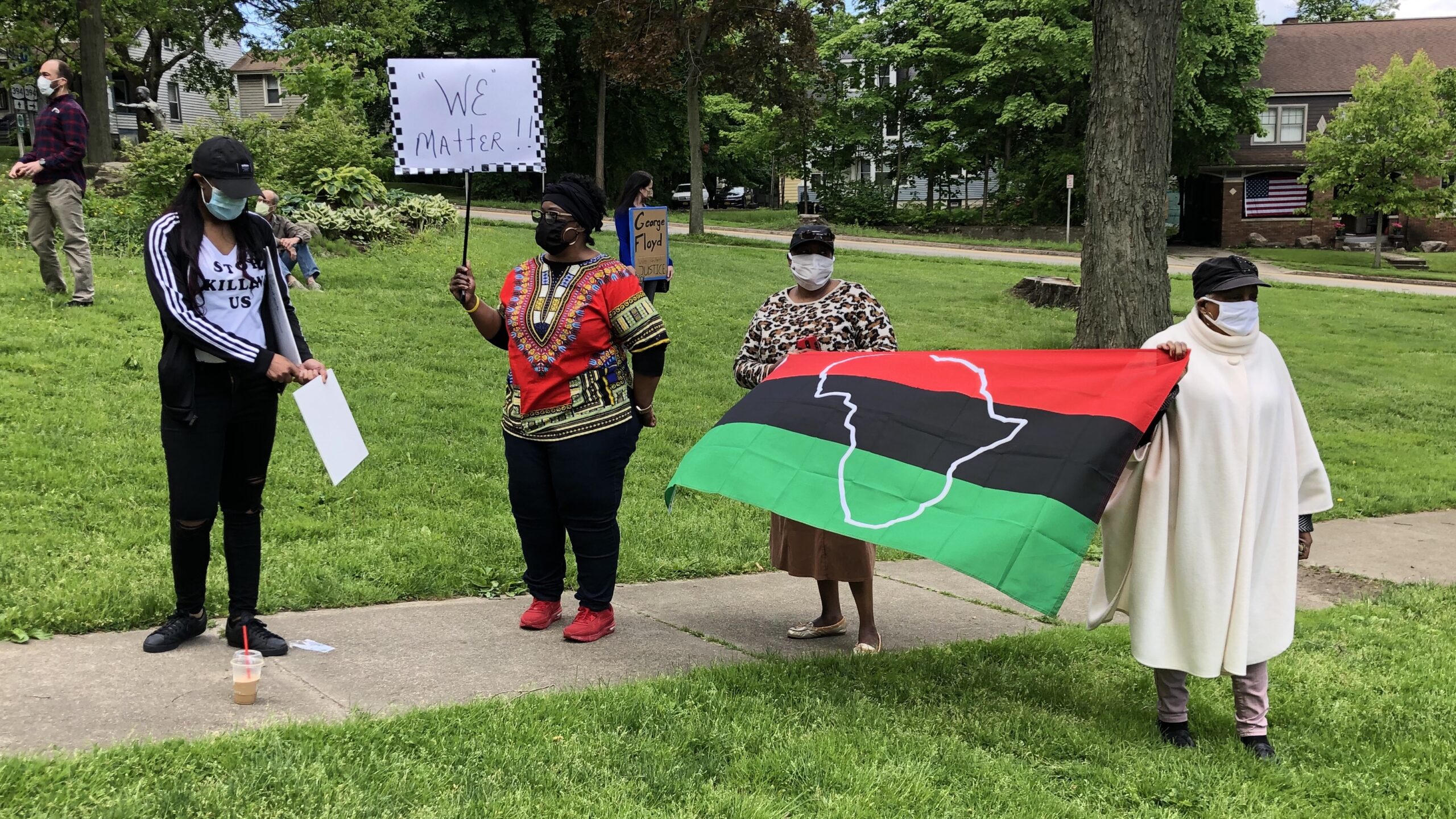 More than 100 people gathered at Dow Park in Downtown Jamestown at noon protesting the death of George Floyd, an African American man killed by a Minnesota police officer last week.