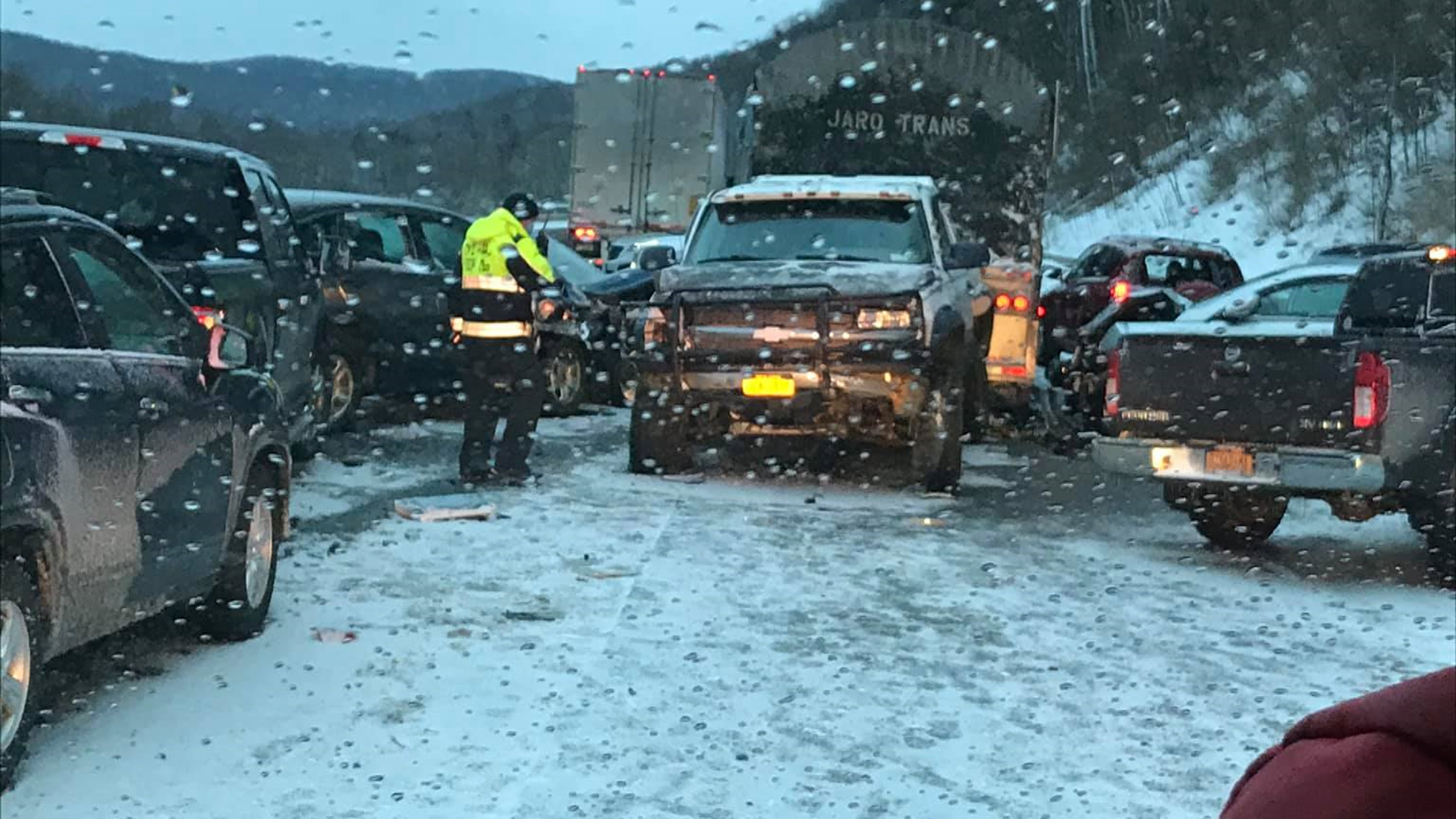 According to the National Weather Service, the snow and wind combined likely caused reduced visibility and slick road conditions.