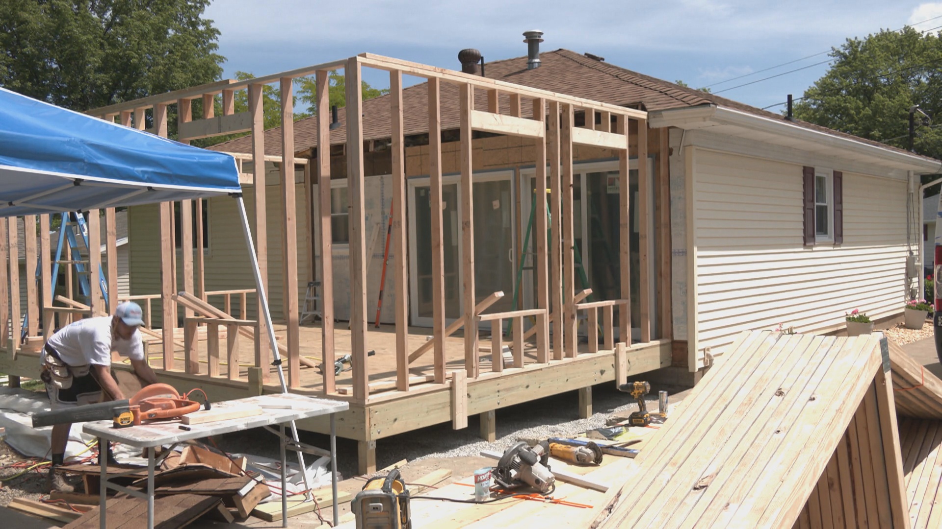 She hired Braendel services to do the job. Carpenter Clayton Dawes says an addition like Neuman’s normally takes 4 weeks, but chasing down materials pushed it back. A 2×4 used to cost them three bucks. Now, it’s costing them eight dollars. Plywood is the same way. A sheet used to be $10 now, it’s running $40.