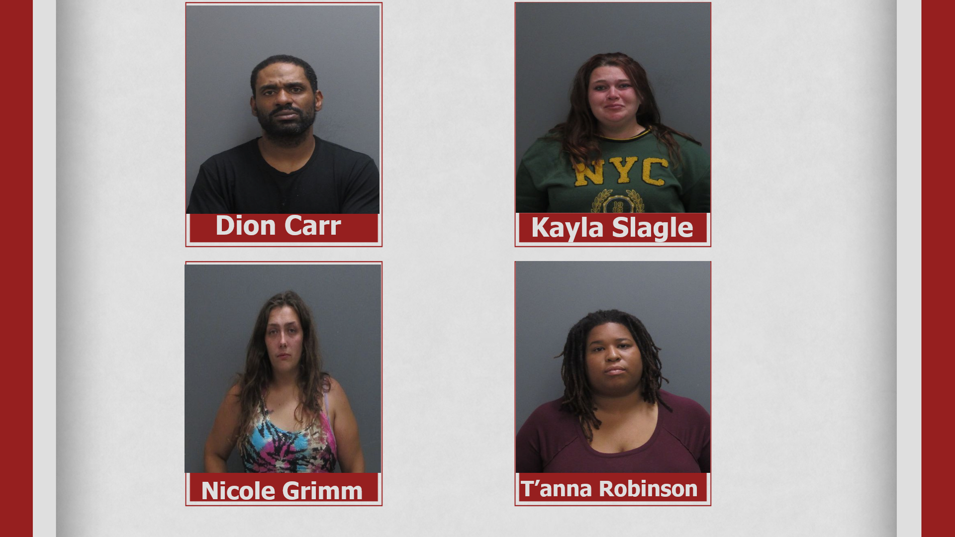Grimm, Slagle and Carr were also charged with Criminal Possession of a Controlled Substance in the 7th Degree.