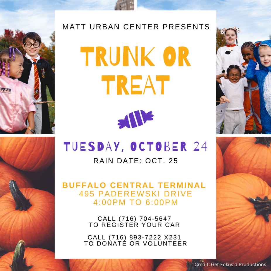On Tuesday, October 24th, from 4:00 pm to 6:00 pm, the Matt Urban Center will host “Trunk or Treat” at Buffalo Central Terminal, offering safe and family-friendly Halloween celebrations. Activities on the Terminal Lawn will include face painting, mask making, cider, and doughnuts. In case of rain, October 25th is the designated rain date.
