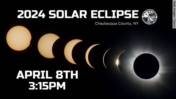 In a further commitment to public safety, Chautauqua County Government will announce details next week about the distribution of free eclipse glasses for residents and visitors. This initiative underscores the county’s dedication to providing protective eyewear, ensuring everyone can safely enjoy the eclipse without compromising their vision. More information on eye safety will also be forthcoming, with public service announcement from our County Health Department.