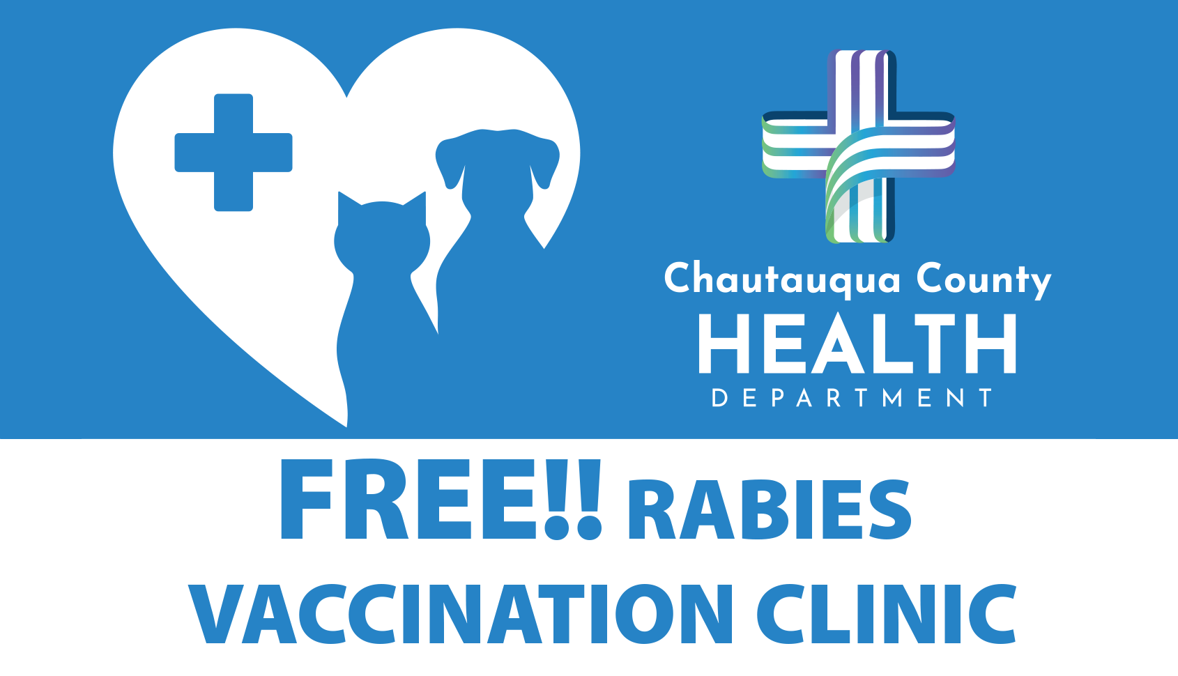 For more information about the clinic call the Chautauqua County Humane Society 716-665-2209. For general rabies information, visit https://chqgov.com/environmental-health/rabies-prevention or contact Chautauqua County Health Department at (716) 753-4481.